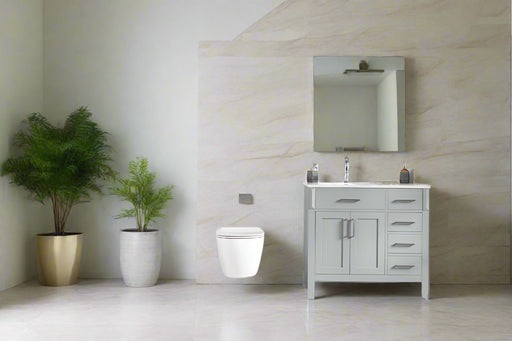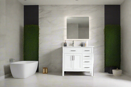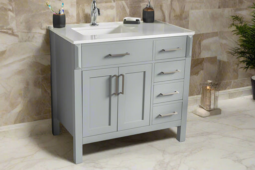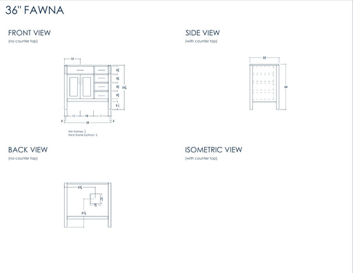 View full detailsSize 34"H x 36"W x 22"D Cashmere or Pure White Quartz Top Options Undermount Porcelain Sink Legs and Drawers are Solid Wood, Frame, and Doors HDF t...