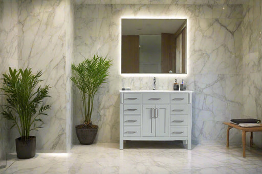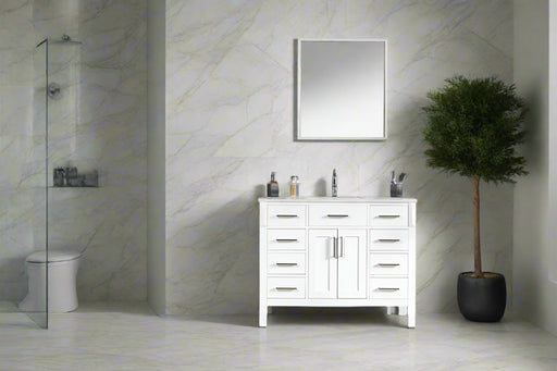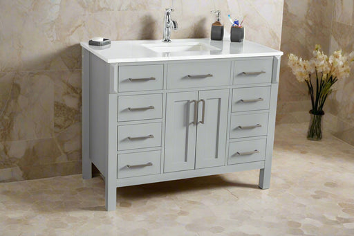 View full detailsSize 34"H x 42"W x 22"D Cashmere or Pure White Quartz Top Options Undermount Porcelain Sink Legs and Drawers are Solid Wood, Frame, and Doors HDF t...