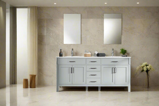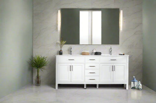 View full detailsSize 34"H x 72"W x 22"D Cashmere or Pure White Quartz Top Options Undermount Porcelain Sink Legs and Drawers are Solid Wood, Frame, and Doors HDF t...